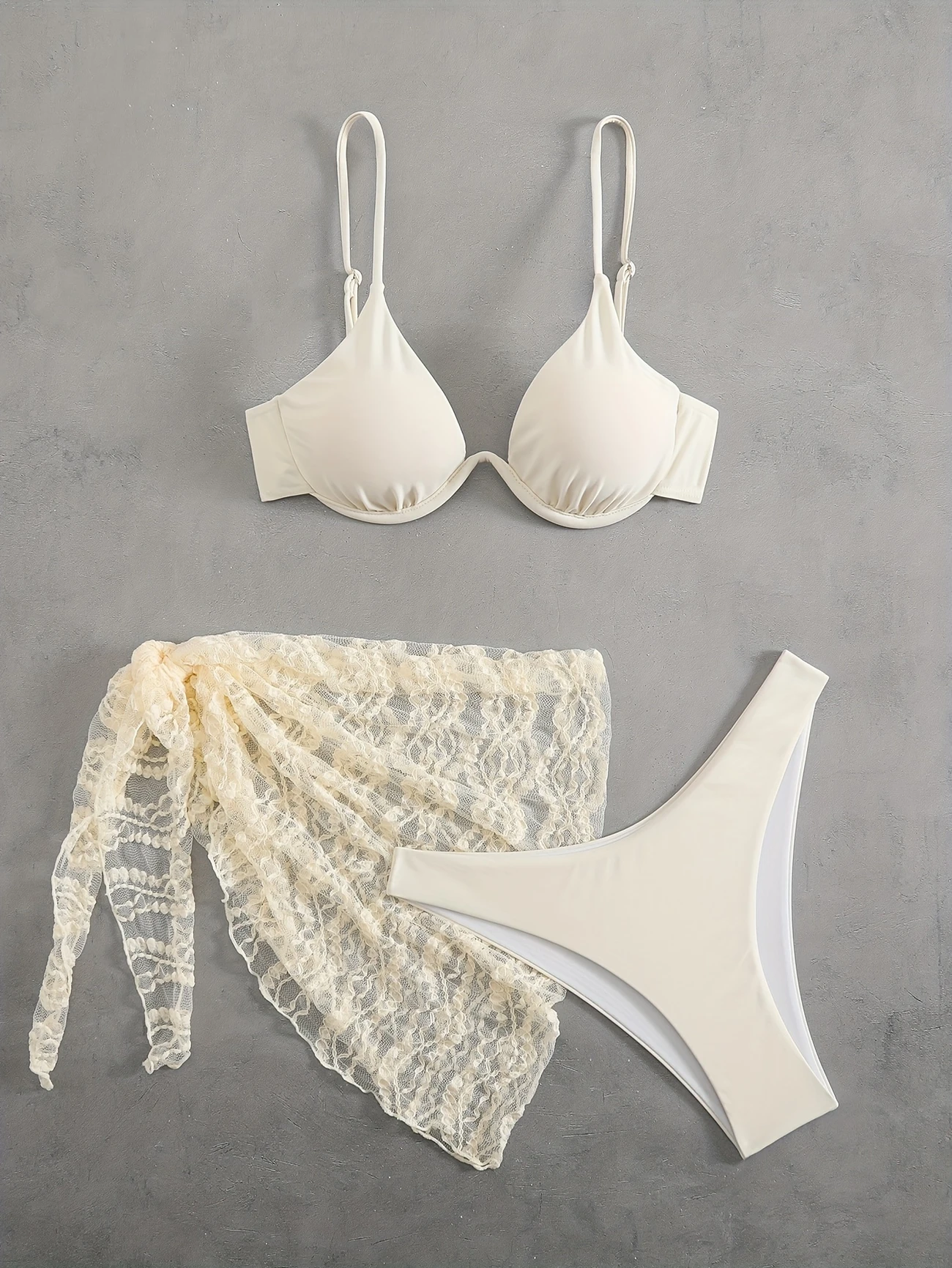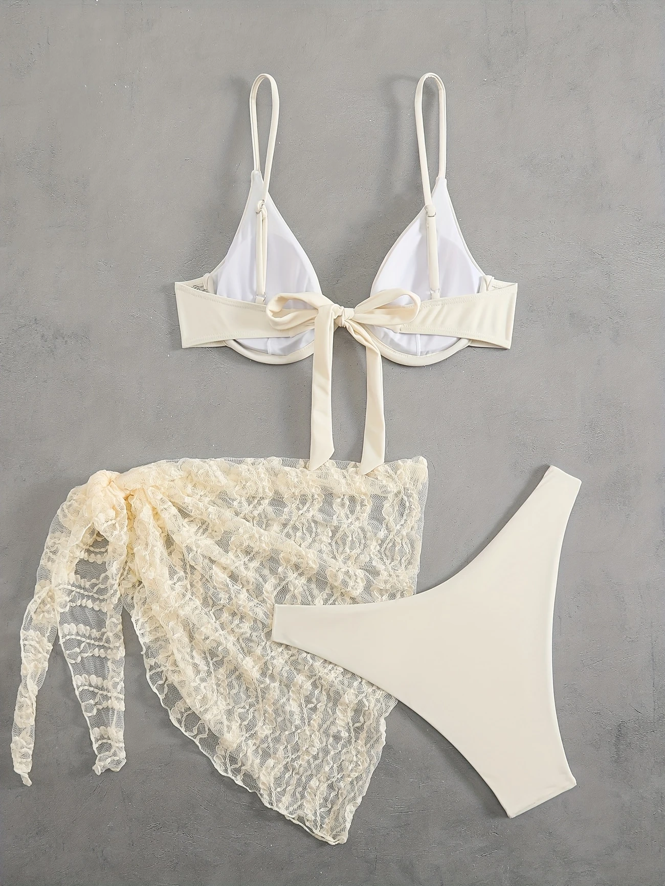 Inspirado en la calma y pureza del amanecer, Alba combina romanticismo y frescura en cada detalle. Su top estructurado realza con sutileza, mientras el pareo de encaje aporta textura y movimiento, sin perder ligereza.